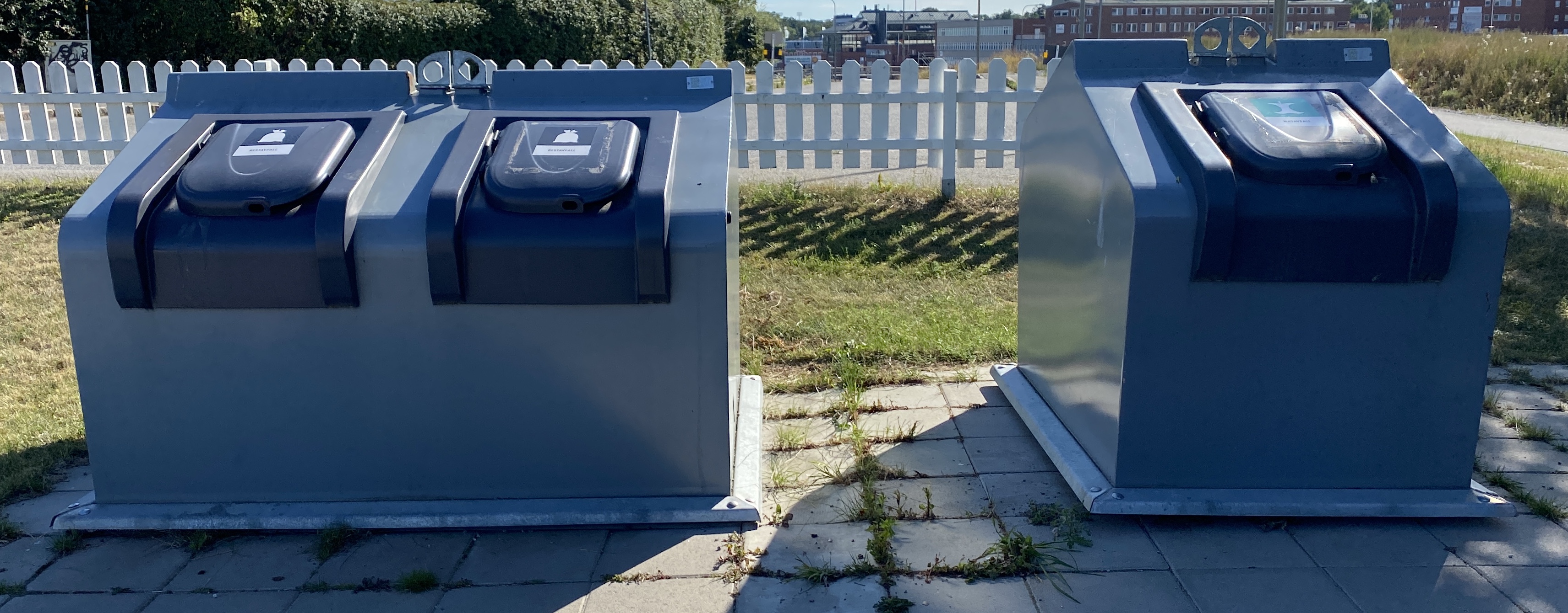 Vi har två behållare, en för matavfall och en för hushållsopor. Påsar för utsortering av avfallet hämtas i samfällighetens gemensamma förråd.